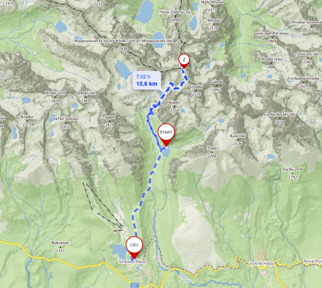 This hike takes from Chata Pri Popradskom plese to Rysy and back to Strbske pleso around 16 km and we managed it in 8 hours, 23mins with 1038 m overall elevation gain.